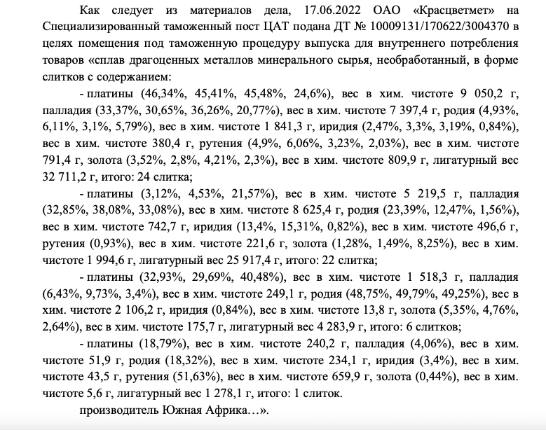 Золото, платину и иридий «Красцветмет» регулярно закупает в Южной Африке, поставки же идут через ОАЭ. К примеру, в июне 2022 года завод задекларировал 53 слитка драгметаллов из ЮАР стоимостью 3,9 млн долларов, которые поставила PALOMA PRECIOUS DMCC. Однако документацию на слитки составлял почему-то не продавец, а менеджер «Красцветмета», а вес товара по разным документам — от места отгрузки (площадки продавца на «золотом рынке» в Дубае) до российского предприятия — колебался от 72 до 70 кг. Уже после выпуска с российской таможни слитки чудесным образом потеряли в весе ещё 10 граммов. Такие истории с потерей веса происходили с южноафриканским золотом по пути от PALOMA PRECIOUS DMCC до Красноярска регулярно. «Красцветмет», как сообщается на его сайте, на 100% принадлежит Красноярскому краю.