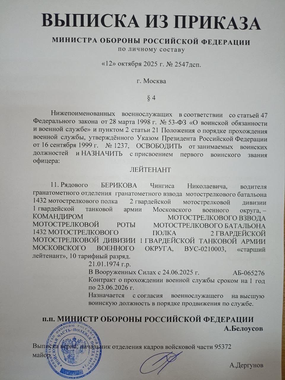 После ухода с госслужбы Бериков пропал из публичной сферы, но «Преступная Россия» нашла его в зоне боевых действий. Согласно выписке из приказа министра обороны РФ Андрея Белоусова, месяц назад бывший следователь назначен командиром мотострелковой роты. Ему было присвоено звание лейтенанта.