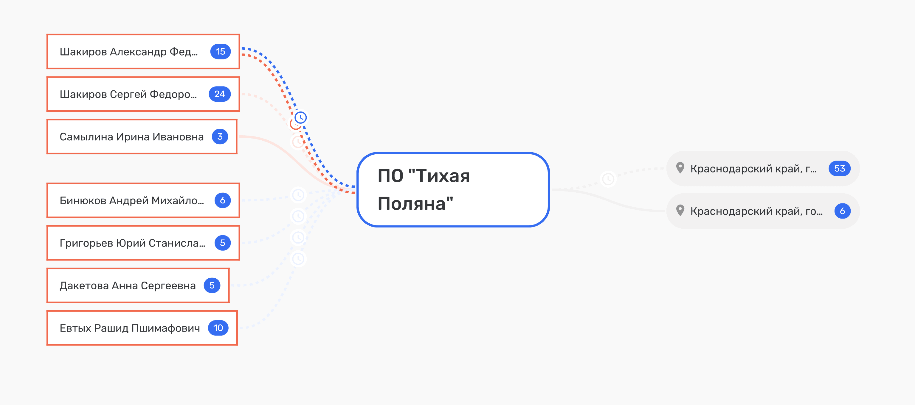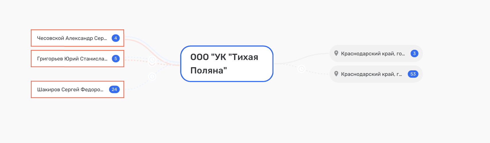 Самылина владела ООО «УК Портланд» с 2016 года, а в 2019-м собственником стал Эльдар Исаев. В этом контексте возникает компания ООО «Центр управления и консалтинга», зарегистрированная 5 декабря 2011 года. Её юридический адрес — Краснодар, проспект Гёте, дом 8, квартира 1; генеральный директор с 4 июня 2015 года — Александр Фёдорович Шакиров. Этот же адрес — проспект Гёте, 8 — всплывает в карточках структур, связанных с «Немецкой деревней». Самылина в 2024-м получала доход в ООО «ЦИК», владельцем которого является Александр Шакиров. И тот же самый Шакиров был учредителем ПО «Тихая Поляна» с 2014 по 2021 годы.