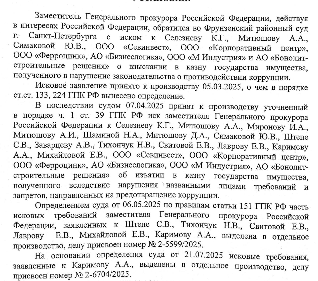 Проходит серия ключевых слушаний. 16 мая суд удовлетворяет основной иск Генпрокуратуры: имущество признано полученным в нарушение антикоррупционного законодательства и обращено в доход государства. Решение имеет «конфискационный» характер — под арест попадают предприятия, доли и паи в ЗПИФах, через которые, по версии следствия, проходили финансовые операции фигурантов.