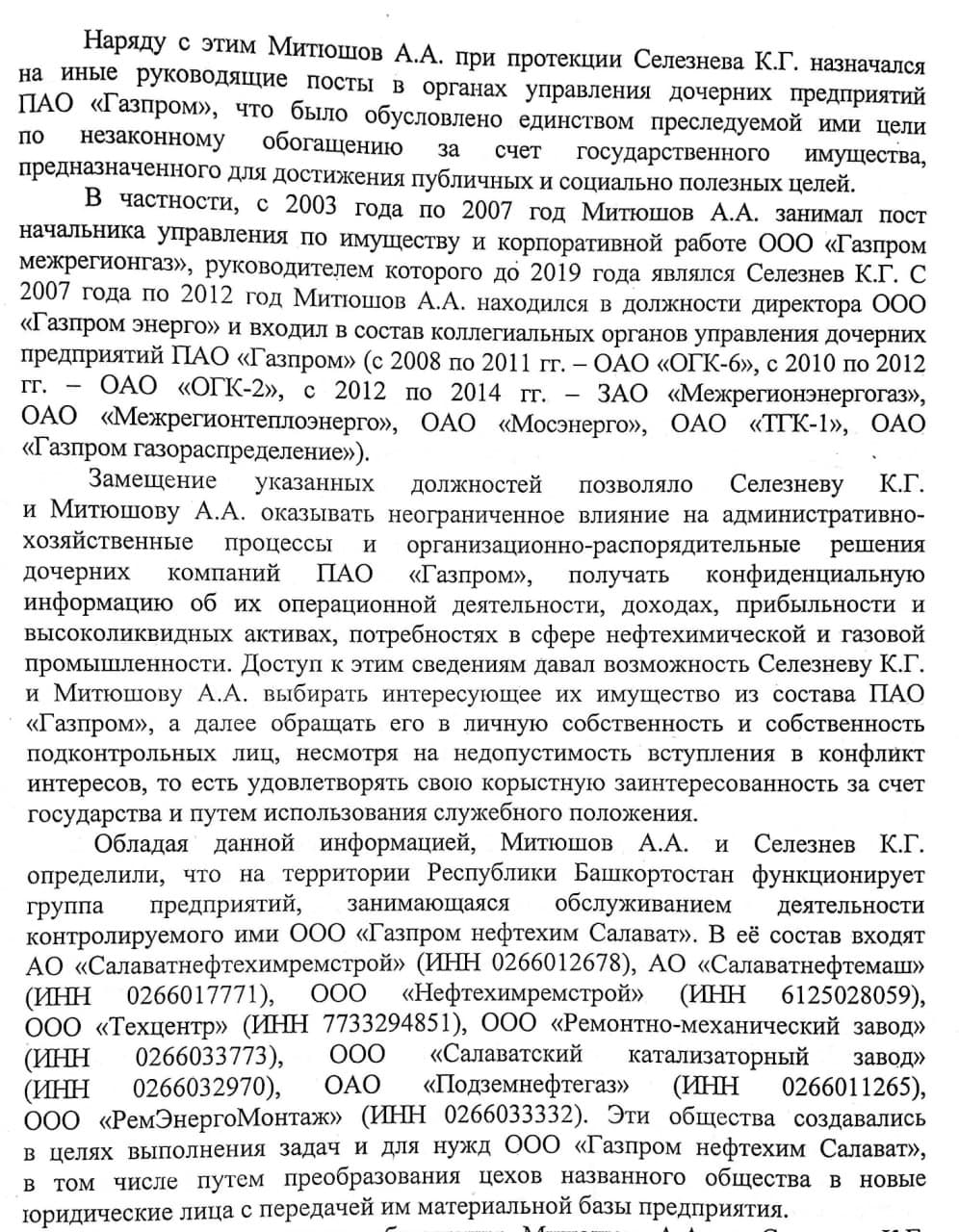 Именно в это время, по версии прокуратуры, Селезнёв и его соратники — Алексей Митюшов, Елена Михайлова и другие руководители среднего звена — начали выстраивать сеть подрядных компаний, через которые финансовые потоки «Газпрома» и «Газпром нефтехим Салавата» перенаправлялись в частные структуры. В судебных документах описаны многолетние схемы фиктивных перевозок, завышенных тендеров и подставных подрядчиков, в результате которых из периметра госкорпорации было выведено не менее 200 миллиардов рублей.