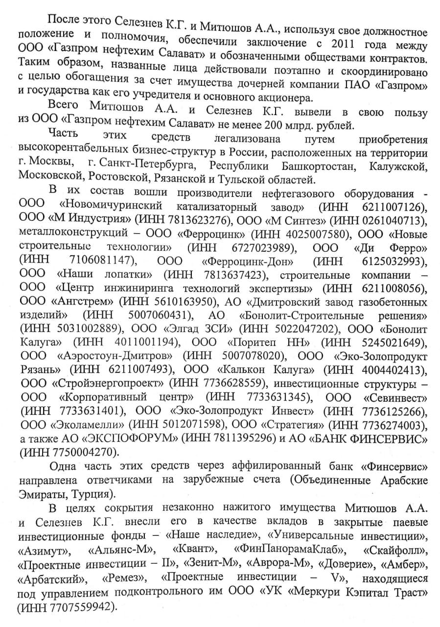 Заместитель Генерального прокурора РФ подаёт иск во Фрунзенский районный суд Санкт-Петербурга. В документе говорится о незаконном выводе активов на сумму свыше 150 млрд рублей. Ответчиками названы бывшие топ-менеджеры «Газпрома», а также десятки компаний и инвестиционных фондов, через которые, по версии прокуратуры, шёл вывод средств из «Газпром нефтехим Салавата».
