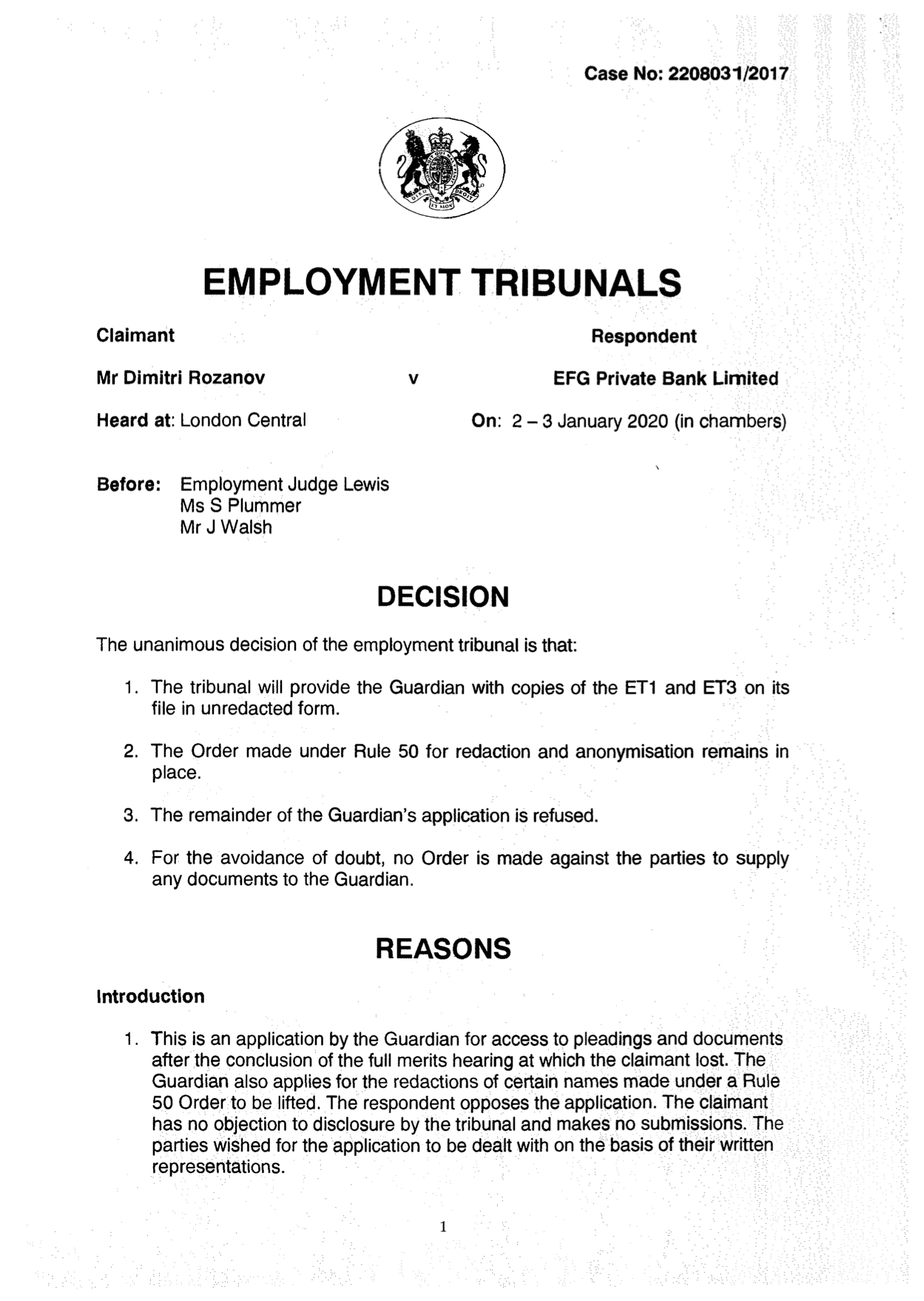 Власти провели обыск в офисе швейцарского частного банка в Великом Герцогстве. По версии источника, знакомого с ситуацией. Расследование спровоцировано вынужденным несправедливым увольнением комплаенс-менеджерабанка Дмитрия Розанова. В ходе разбирательства по соглашению сторон было принято постановление, в соответствии с Правилом 50 о засекречивании имен клиентов банка-ответчика, а также трех лиц, чьи имена, в случае раскрытия, позволили бы идентифицировать клиентов. В рамках дела ответчик так и не раскрыл материалов закрытого заседания публично.