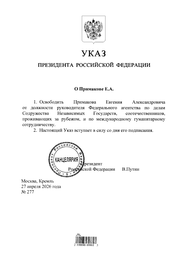 Примаков занимал этот пост в Федеральном агентстве по делам СНГ, соотечественников и международному гуманитарному сотрудничеству (Россотрудничество) с 2020 года. За заслуги перед Отечеством он был награжден орденом Почета 11 февраля этого года.