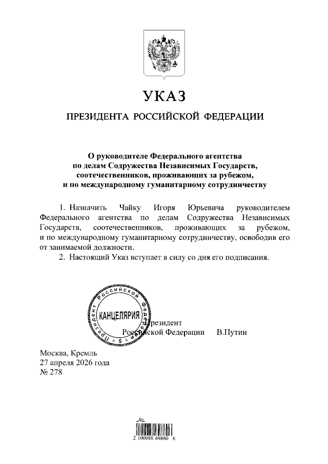 Должность нового главы Россотрудничества занял Игорь Чайка, который был ранее заместителем руководителя ведомства. Указ сегодня опубликован на сайте.