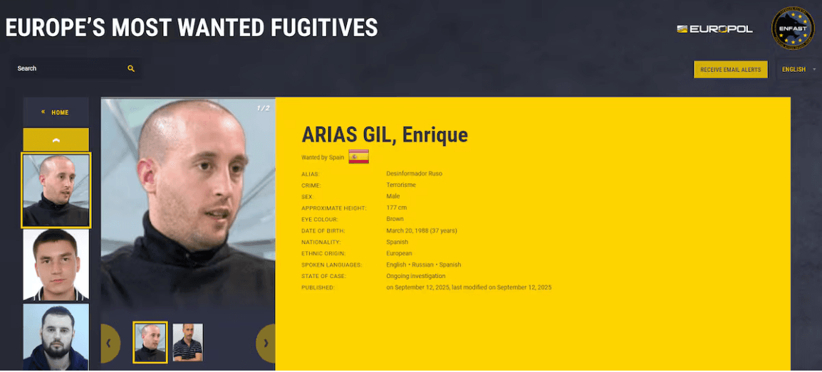 Энрике Ариас Гиль, 37-летний испанец с псевдонимом Desinformador Ruso, находящийся в базе розыска Europol — Europe’s Most Wanted как разыскиваемый Испанией (карточка опубликована 12 сентября 2025 года), обвиняемый в «нанесении ущерба с использованием компьютеров в целях терроризма и участии в преступной организации», получил убежище в России.