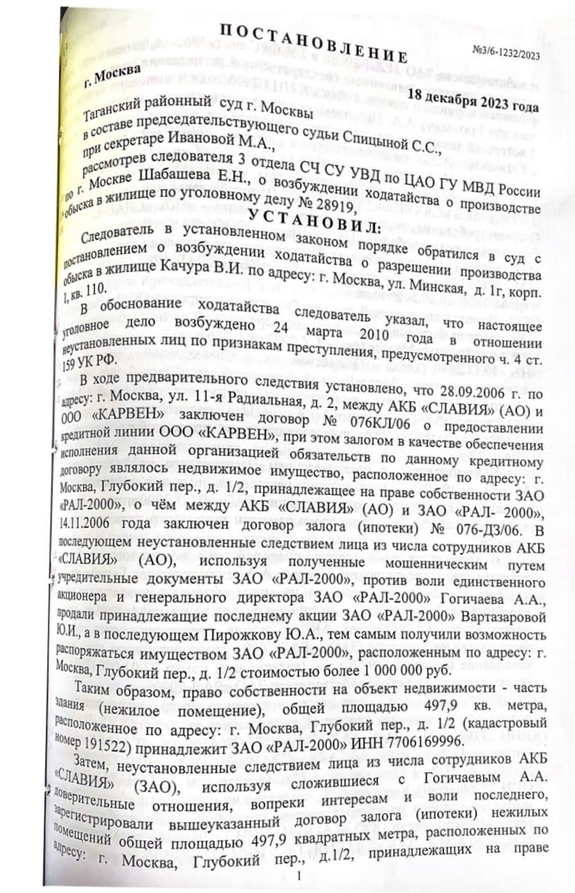 Так, в марте 2024 года следствие ЦАО, получив разрешение суда, провело ряд обысков в банке «Славия», доме Мехдиева, Качура и иных лиц, причастных, по мнению следствия, к рейдерскому захвату помещения в центре Москвы.