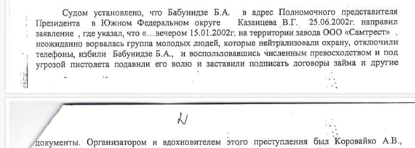 «В 2001-2002 годах Коровайко А.В. установил доверительные отношения с директором вино-водочного завода ООО «Самтрест» Бабунидзе Б.А. и его бизнес-партнером Хабулиани Р.Ш., после чего, через подконтрольного ему Рукавишникова А.В. – брата своей супруги Рукавишниковой И.В. и аффилированное им ООО «Эридан-Юг», с применением физических мер и психологического давления принудил руководство завода передать учредительные документы, печати и подписать бланки общества, которые Коровайко А.В. использованы для изготовления подложных договоров займа и инициирования на их основании судебных разбирательств о взыскании фиктивной задолженности, обращении взыскания на 100% долей уставного капитала ООО «Самтрест» и признании его банкротом, перерегистрации на ООО «Эридан-Юг» прав на имущественный комплекс завода для распоряжения им в своих интересах», — говорится там же.