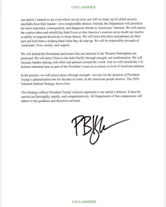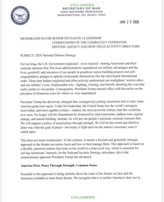 Опубликованная 23 января 2026 года 34-страничная Стратегия национальной обороны США–2026 фиксирует для Пентагона (в документе демонстративно используется формула Department of War) принципиально иной приоритет: не «управление мировым порядком», а защита территории США, контроль Западного полушария и сдерживание Китая — при одновременном сокращении «авансирования безопасности» европейских союзников. Лейтмотив сформулирован предельно прямо: отказ от интервенционизма, «бесконечных войн» и смены режимов, вместо этого — «практические, конкретные интересы американцев» и «мир через силу», где сила понимается как готовность к решительным операциям при минимизации распыления ресурсов.