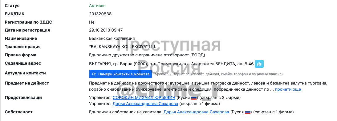 На сэкономленные на насосе Калининской АЭС, заработанные «тяжким трудом», деньги Сахаров зарегистрировал в Болгарии в 2010 году компанию BALKANSKAYA KOLLEKCIYA Ltd. Несколько раз он переписывал фирму на сестру и других родственниц, а пару недель назад BALKANSKAYA KOLLEKCIYA вновь была записана на Дарью Сахарову. В числе директоров болгарской компании Сахарова были его старый деловой партнёр из Тверской области Валерий Борко, а также Михаил Сорокин — он руководил также компанией «БЪЛГАРИЯ АТОМ СТРОЙ ЕНЕРДЖИ», которая занимается строительством на объектах атомного энергокомплекса. Эта компания первое время работала под руководством местных строителей — братьев Дончевых, которые занимаются строительством частных резиденций и малоэтажных домов по всей Болгарии. Вероятно, именно у них Сахаров приобрёл собственную болгарскую недвижимость.