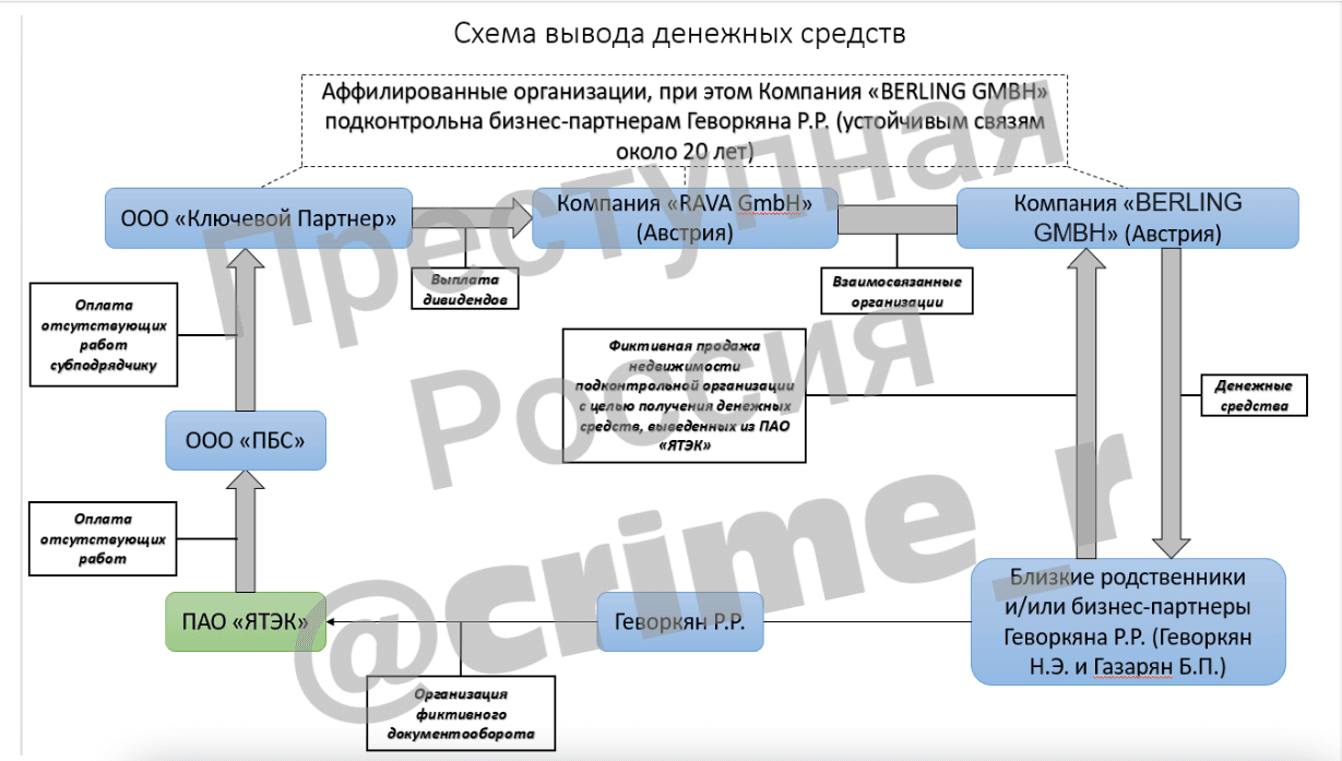Так, по 25% в ОАО «АК “Электросевкавмонтаж”» принадлежит австрийской RAVA GmbH и IMT Montenegro Budva (Черногория). RAVA GmbH использовали при выводе средств из ПАО «ЯТЭК» её генеральный директор Рубен Геворкян, его многочисленные родственники и связанные с ними лица.