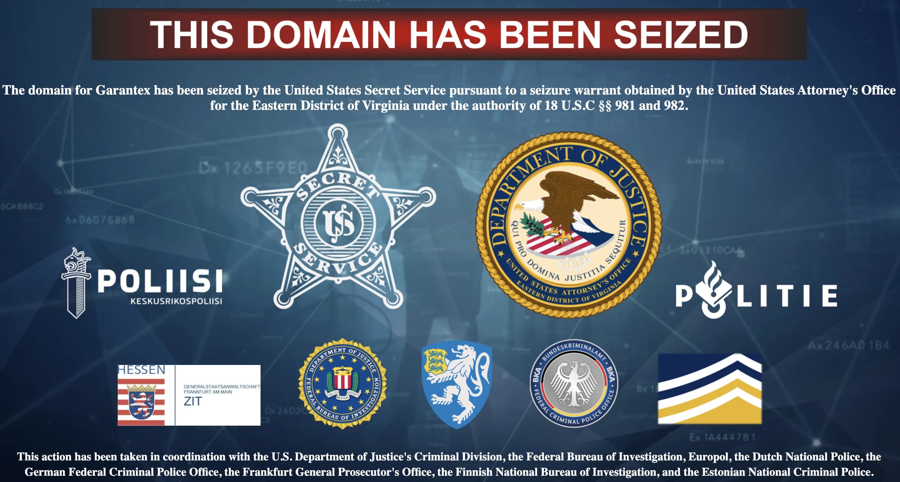 На сайте Garantex в этот момент появилось сообщение об изъятии домена Секретной службой США на основании ордера, полученного прокуратурой Восточного округа Вирджинии (в сообщении перечислены партнёры, участвовавшие в операции: DOJ Criminal Division, FBI, Europol, полиция Нидерландов, немецкое BKA, прокуратура Франкфурта, финское NBI и эстонская кримполиция).