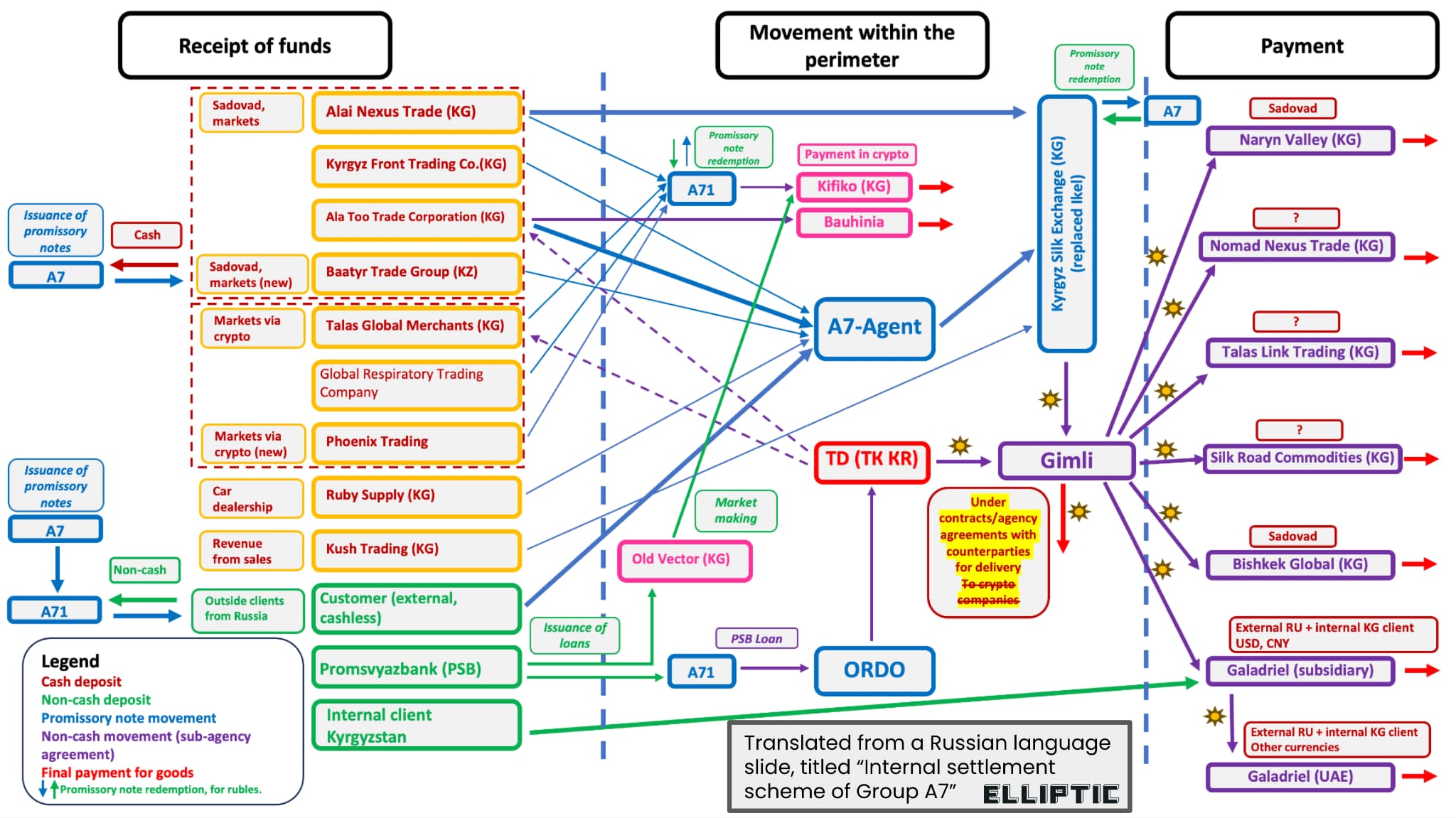 Параллельно сама группа A7 в 2024–2025 годах масштабировала «внешнюю» платёжную сеть. На своём сайте A7 заявляла о работе с валютами USD, EUR, CNY и AED. Центр информационной устойчивости (CIR) в отчёте 6 октября 2025 года писал, что A7 «утверждает», будто провёл $86 млрд транзакций менее чем за год, и что 78%операций A7 проходили через китайские юрисдикции.