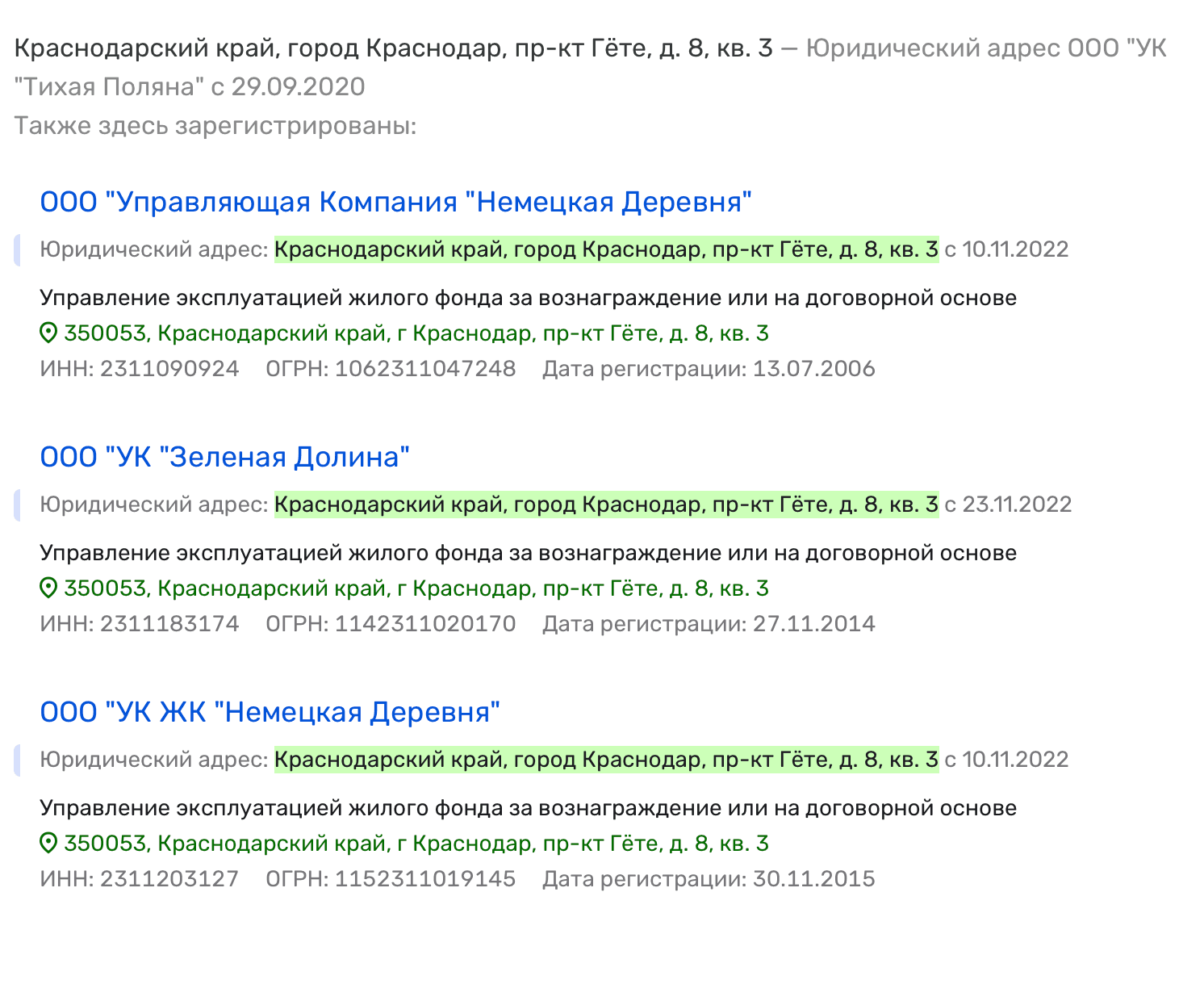 Параллельно Самылина всплывает ещё в одной «строительно-коммунальной» оболочке — ПО «Тихая Поляна», зарегистрированной 29 января 2014 года по адресу: Краснодар, ул. им. Каляева, 263, офис 8. В карточках «Тихой Поляны» она фигурирует как ликвидатор в период 2018 года, а сама организация ликвидирована 11 декабря 2018-го. И параллельно появляется другая компания со схожим названием — ООО «УК Тихая Поляна», и адрес — тот самый «дом, где живут все»: Краснодар, проспект Гёте, 8, кв. 3. Именно по этому адресу зарегистрированы сразу несколько компаний, связанных с периметром Ризванагаджи Исаева. Во-первых, ООО «УК Тихая Поляна» (директор — Александр Сергеевич Чесовской). Во-вторых, ООО «УК Зелёная Долина» — зарегистрировано 27 ноября 2014 года. И наконец, ООО «УК ЖК Немецкая Деревня» зарегистрировано 30 ноября 2015 года, учредителем которого выступает, опять же, сын нашего бывшего депутата — Исаев Эльдар Ризвангаджиевич.