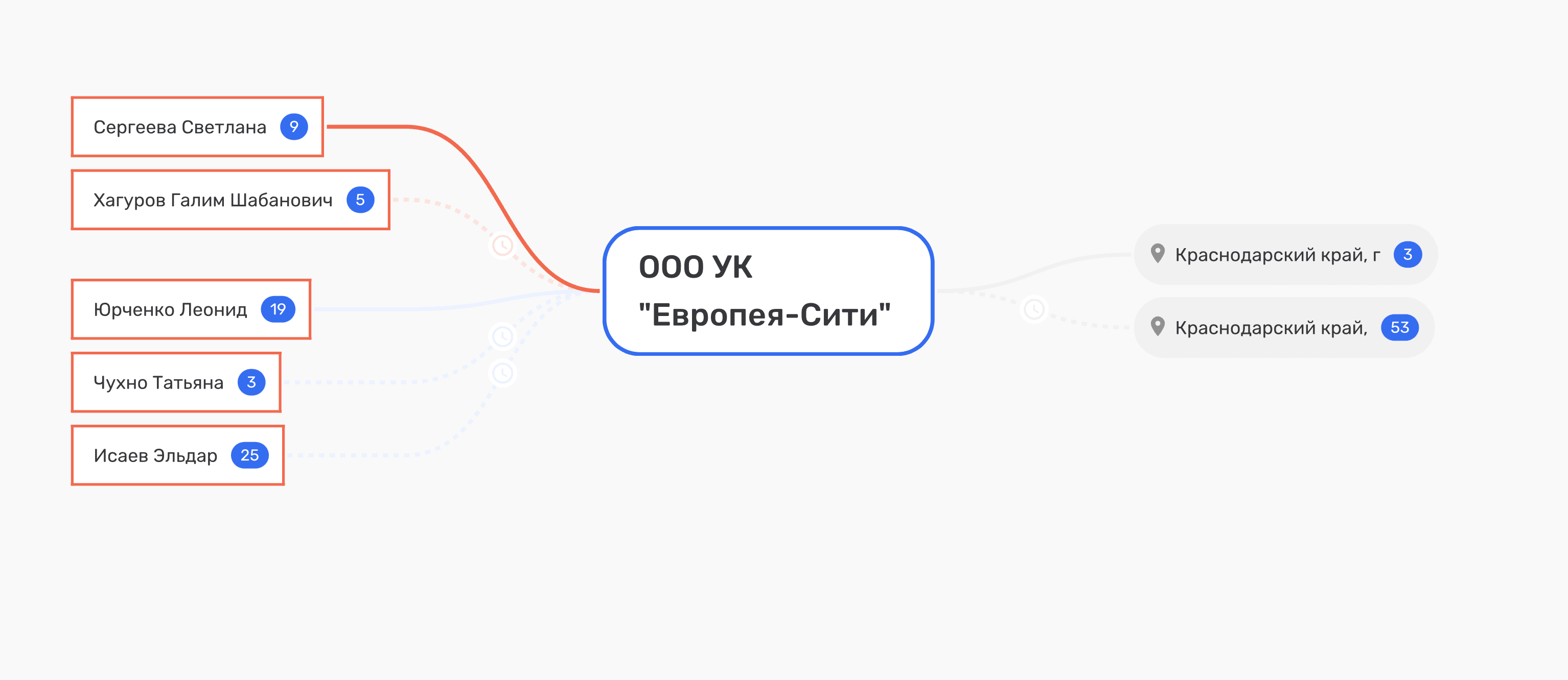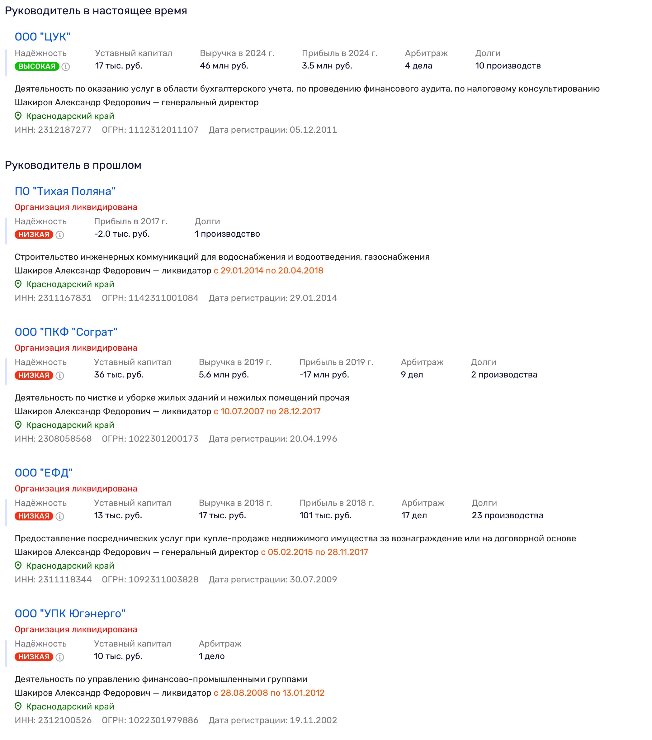 Самылина владела ООО «УК Портланд» с 2016 года, а в 2019-м собственником стал Эльдар Исаев. В этом контексте возникает компания ООО «Центр управления и консалтинга», зарегистрированная 5 декабря 2011 года. Её юридический адрес — Краснодар, проспект Гёте, дом 8, квартира 1; генеральный директор с 4 июня 2015 года — Александр Фёдорович Шакиров. Этот же адрес — проспект Гёте, 8 — всплывает в карточках структур, связанных с «Немецкой деревней». Самылина в 2024-м получала доход в ООО «ЦИК», владельцем которого является Александр Шакиров. И тот же самый Шакиров был учредителем ПО «Тихая Поляна» с 2014 по 2021 годы.