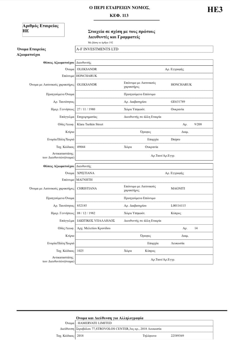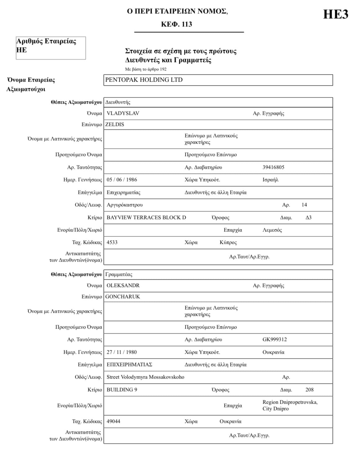 С этой целью в 2025 году Зельдис (гражданин Кипра, Израиля и Украины) и Гончарук учредили две компании на территории Кипра («Pentopak Holding LTD», HE 478696, и «A-F Investments LTD», HE 477497), заключили соглашение с Дмитрием Пуниным на осуществление незаконного трансфера денежных средств с территории РФ на территорию Кипра, а в дальнейшем — Украины, путём использования подконтрольных Дмитрию Пунину технических, игровых и маскировочных технологий. В свою очередь общий контроль за осуществлением подобного рода сделок, а также отсутствие претензий со стороны правоохранительных органов Кипра обеспечивал ныне покойный Ставрос Демосфенус.